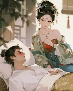 Ta cởi bỏ xiêm y mỏng manh, đ/è hắn xuống giường: