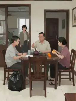 Bên kia bàn, một chồng hồ sơ được bày ra ngăn nắp. Giấy chứng nhận nhà đất, đăng ký xe, sổ tiết kiệm - anh trai đang ký tên từng tờ một.