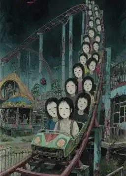 「Chào mừng đến với trò chơi sinh tồn tại Thị trấn Cổ Tích.」 Giọng nói điện tử vang lên từ trên cao, đi kèm theo những tiếng hét chói tai. Đoàn tàu lượn khổng lồ lao vút qua. Khi lên đến đỉnh, vô số cái đầu rơi xuống đồng loạt. Tôi vặn cổ nhìn lại - một trong số đó, mang khuôn mặt giống hệt tôi.