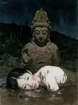 Chị dâu ch*t. Ch*t trong hố sụt do tượng Bồ T/át bằng đất đổ ở khe núi. Ngâm ba ngày, toàn thân trắng bệch. Dân làng bảo đó là Bồ T/át bảo vệ, đàn bà trong làng không chạy thoát được. Mẹ tôi phun nước bọt vào tượng: "Ực, ch*t rồi thì có ích gì, hưởng bao nhiêu hương khói, có giỏi thì trả người sống về đây!" Đúng mười ngày sau, tôi lại phát hiện chị dâu sống nguyên vẹn trong cái hố ấy.